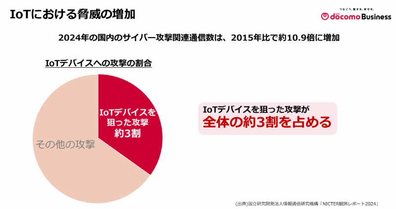 NTTドコモビジネスは2025年9月、セキュリティ機能を標準搭載したIoTサービス『docomo business SIGN』を12月に提供開始すると発表、執行役員の小嶺一雄が説明しました。2024年にはサイバー攻撃関連通信数が2015年比で約10.9倍に増加し、そのうち約3割はIoTデバイスが標的。IoTデバイスは処理性能の制約からセキュリティが脆弱になりやすく、導入の課題も指摘されていました。