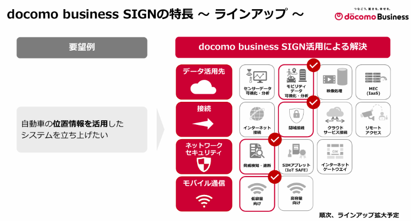 「自動車の位置情報を活用したシステムの立ち上げ」を例として『docomo business SIGN』の機能ラインアップについて解説しました。