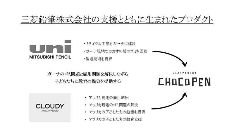 アフリカ・ガーナの路端に廃棄され続けているカカオの殻。放置すれば、土壌の生態系悪化や、腐敗に伴う蚊の増殖・マラリア蔓延といった衛生面での課題につながります。この“ゴミ”を原料にして鉛筆を製造し、雇用創出と、ガーナの子どもたちへの教育支援につなげているのが「CHOCOPENプロジェクト」です。