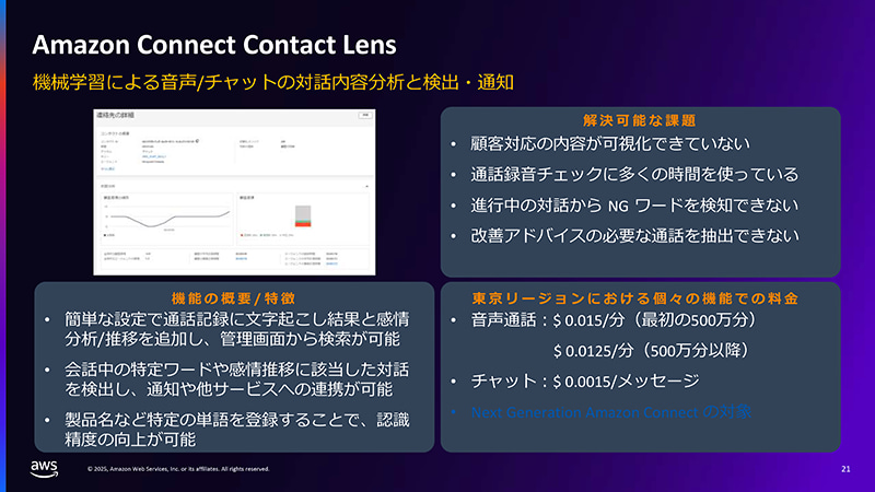 久保田氏:まず「Amazon Connect Contact Lens」では、オペレーターと顧客の会話をリアルタイムで文字起こしし、AIが顧客の感情変化を分析・可視化します。これにより、「対応内容を後からしか確認できない」「録音チェックに多くの時間がかかる」といった従来の課題を解決できます。
