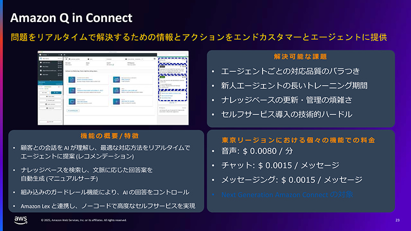 もう1つの重要なAI機能が、生成AIが社内ナレッジなどを検索し、対話中のオペレーターに推奨対応アクション候補を提示できる「Amazon Q in Connect」です。