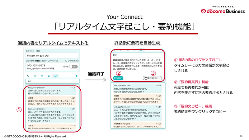 橋本は、Your Connectに搭載された生成AI機能のうち、特に注目すべき2つの機能を紹介しました。1つ目は、通話内容をリアルタイムで文字起こしし、通話終了後に自動で要約を生成する「要約機能」。2つ目は、オペレーターが通話中に疑問を感じた際に、社内ナレッジを自動で検索し、最適な情報を即座に提示する「ナレッジレコメンド機能」です。これらの機能によって、オペレーターの業務効率化だけでなく、顧客対応の品質向上も期待されています。