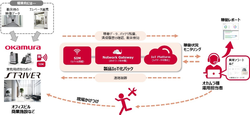 2022年から事業展開しているオカムラの業務用掃除ロボット「STRIVER(ストライバー)」。同社初の掃除ロボット事業としてビルメンテナンス会社と共同で運用を続けるなか、機体の遠隔管理や稼働データの収集・可視化などの実現に向け、2023年からIoT化プロジェクトがスタートしました。その実現に向け導入したのが、NTTコミュニケーションズ(以下、NTT Com)の「製品IoT化パック」です。